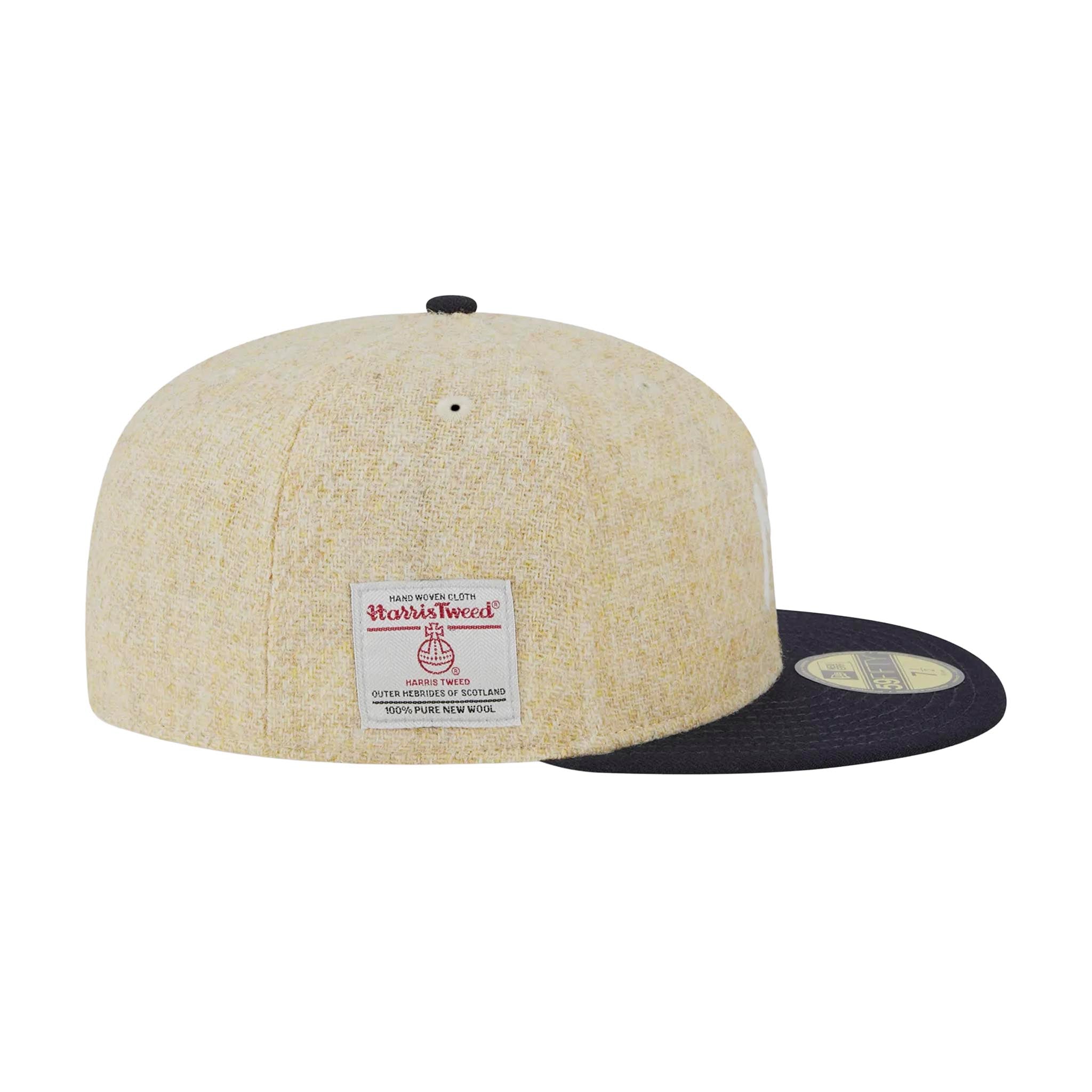 Esta edición destaca por su corona confeccionada en lana Harris Tweed, que aporta un acabado sofisticado y duradero. En la parte frontal luce el logotipo bordado de los New York Yankees, mientras que en el lateral derecho incorpora el parche de autenticidad de Harris Tweed, resaltando el carácter exclusivo de esta colaboración. El flag de New Era bordado en el lado izquierdo completa el diseño con el sello característico de la marca.